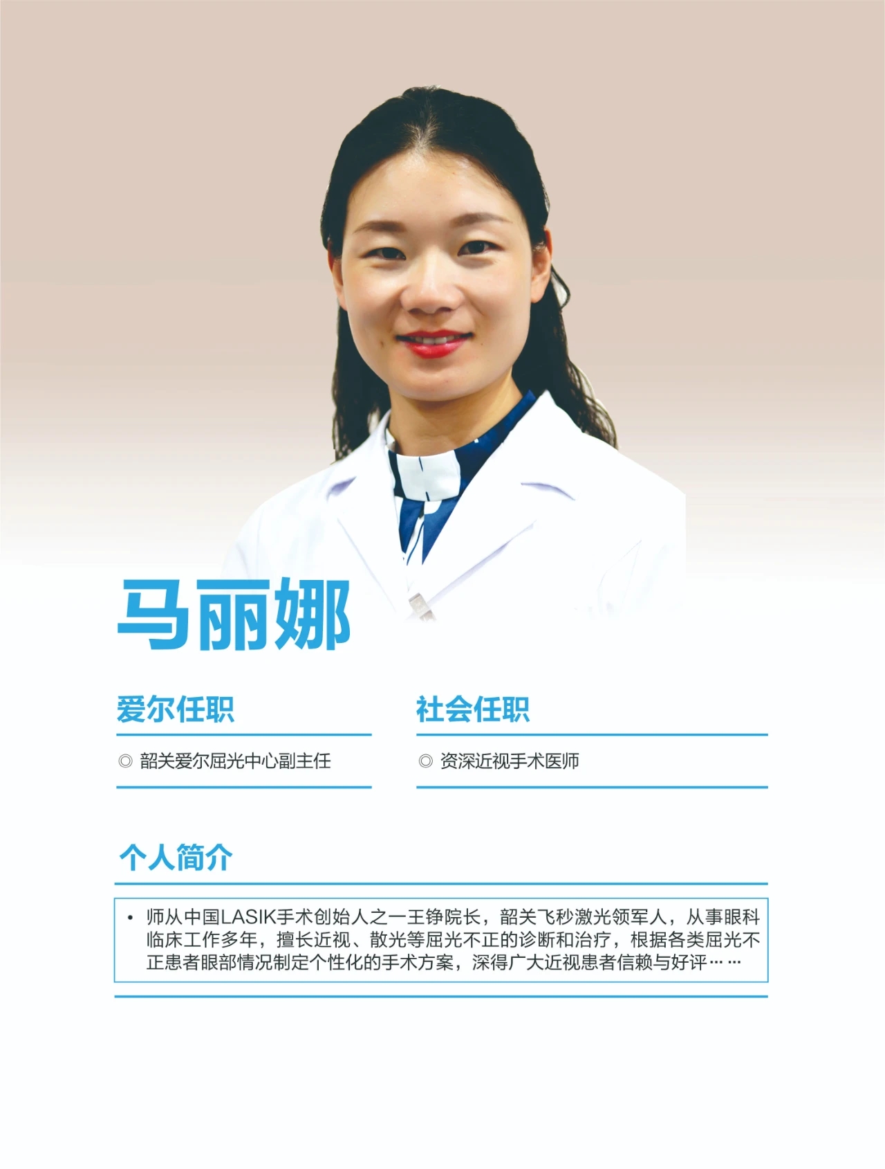 屈光近視矯正中心是韶關愛爾眼科醫院有限公司的重點科室,由中國衛生行業標準《準分子激光角膜屈光手術質量控制》起草人、博士生導師王錚教授領銜,王愛琴副院長親自掛帥,醫師馬麗娜等人組成一支技術精湛的近視矯正團隊,全面開展各類屈光手術。該科室具備矯正近視的全解決能力,開展超10種近視術式:飛秒激光、ICL晶體植入術等,全面矯正1800度內近視以及600度內散光。