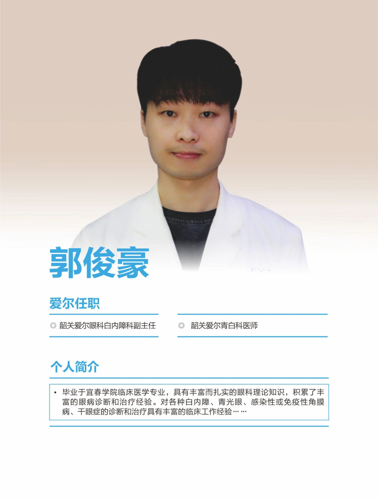 韶關愛爾眼科醫院有限公司白內障團隊擁王愛琴院長(愛爾眼科粵北區)、丘韶瓊院長、郭俊豪主任等多位專科醫生,具備同步國際的白內障手術能力,能熟練開展各項常規及疑難白內障手術。 可開展微切口煥晶白內障手術,植入多焦晶體或多焦+散光矯正晶體,在治療白內障同時同步解決遠視/近視、老花眼、角膜散光等屈光問題,醫生手術經驗豐富,為眾多患者帶來更舒適的視覺。