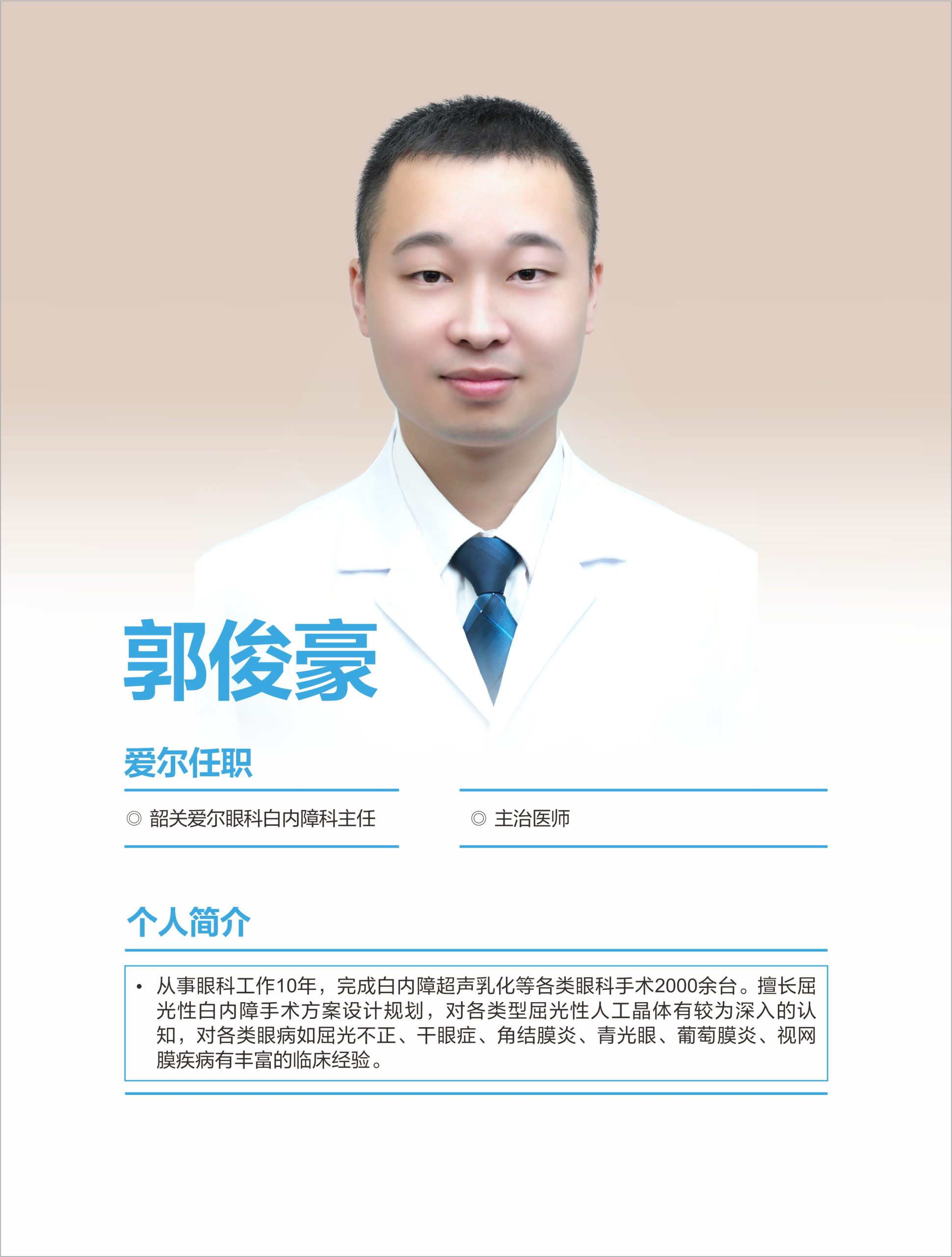 從事眼科工作10余年,擅長屈光性白內障手術方案設計規劃,對各類型屈光性人工晶體有較為深入的認知,對各類眼病如屈 … 繼續閱讀“郭俊豪”